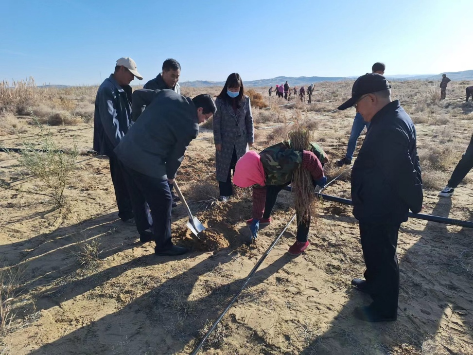 启动会前,参会专家、领导和科研骨干一行前往项目实施基地白芨滩自然保护区中部大柳毛子沙区场进行了现场考察,科研骨干对正在栽植四翅滨藜的工人进行了现场培训和指导。