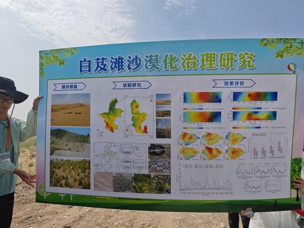 随后在灵武白芨滩国家级国家自然保护区,我校展秀丽老师就白芨滩沙漠化治理研究进行介绍,重点介绍了“草方格”固沙技术及其相关科研成果。
