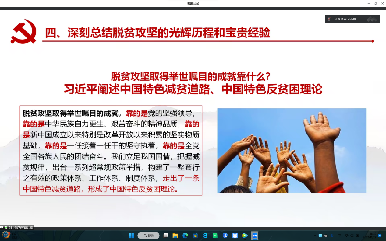 刘小鹏向大家介绍了全国脱贫攻坚总结表彰大会和我国脱贫攻坚战取得全面胜利的庄严宣告,并带领同学们从脱贫攻坚取得的伟大成就、光辉历程和宝贵经验等方面进行深入学习。
