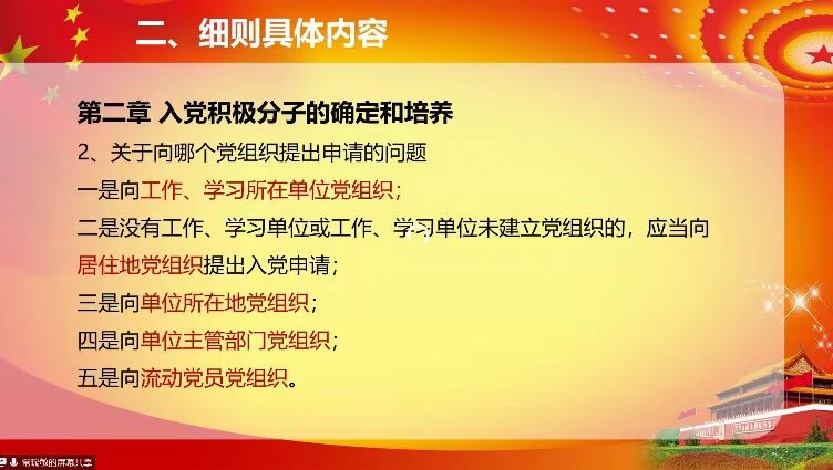 随后依据《中国共产党发展党员工作细则》,细致全面地对发展党员工作的5个阶段进行讲解,明确入党申请人从提出申请到被吸收预备再到转正审批等各个阶段的基本要求和注意事项,向参与听课的同学们明确党员发展工作的纪律性和严肃性。
