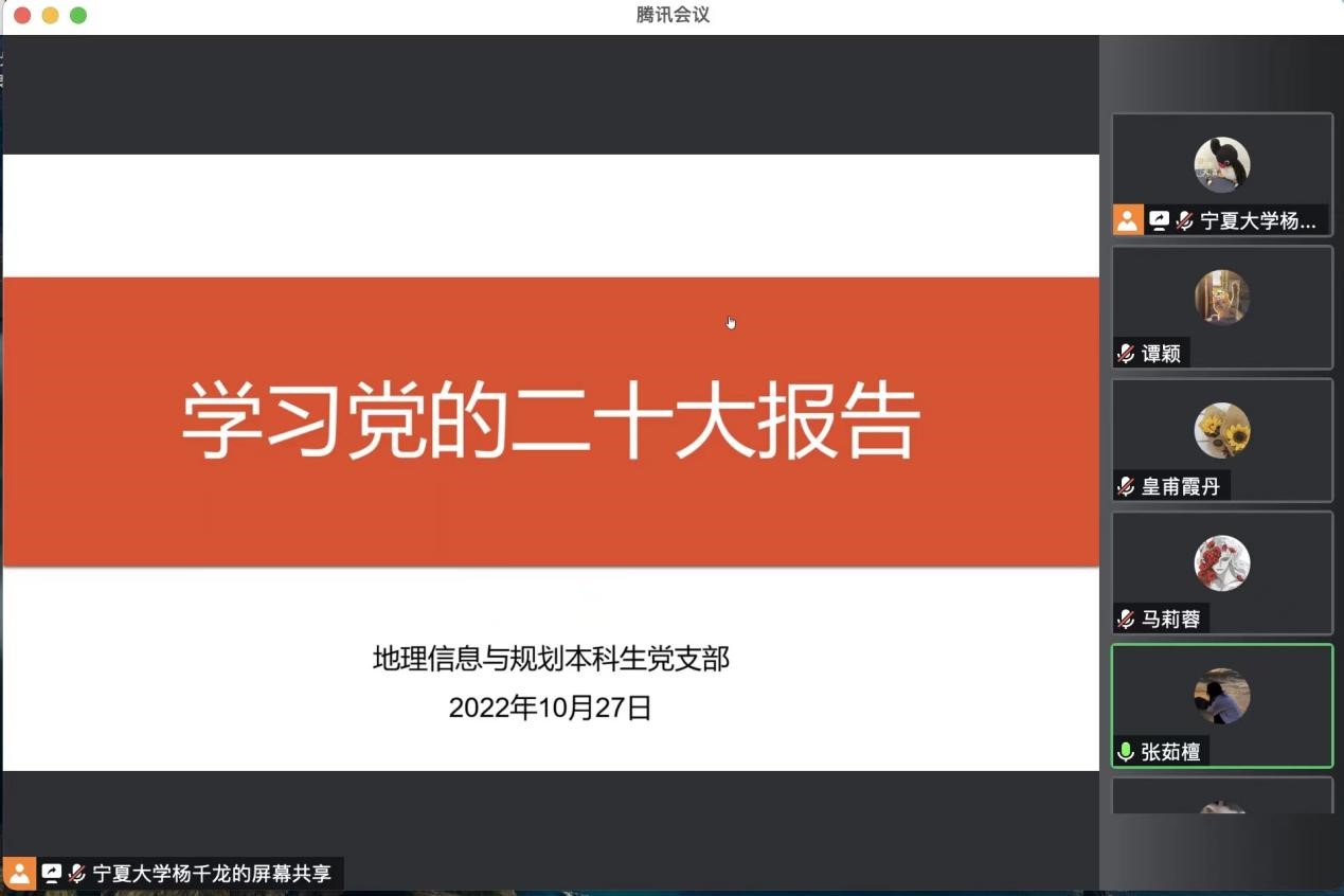 2022年10月27日下午,地理信息与规划本科生党支部线上集体学习党的二十大报告,学习会由谭颖主持。