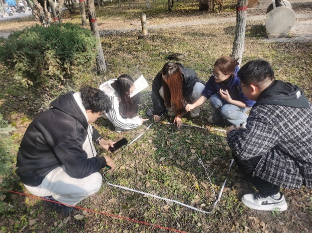 10月31日,何俊、李茜老师带着同学们在校园开展了以“调查植物组成 分析群落结构”为主题的课程实践。四个小组分别被安排在学校的三个校区,开展植物组成和群落结构调查实践。同学们分工明确、通力合作,呈现出一派忙碌而快乐的景象。各小组将课堂所学的植物调查等知识和课程实践紧密结合,顺利完成了样方设置、植物识别、数据调查、资料记录等工作。调查工作结束后,同学们利用晚上的时间,对采集的植物标本进行了压制。