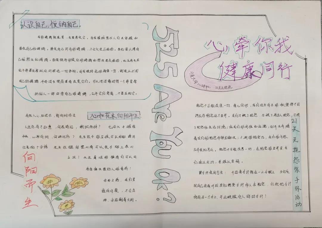组织学生在学院101教室观看《理想照耀中国》的电影,使学生在自我领悟、自我反省、自我提高中,达到自我教育的目的,同时帮助同学们树立维护心理健康的意识。此外,各班心理委员组织本班同学召开班会,并以手抄报的形式表达自己对心理健康的看法。同学们参加活动热情高涨,手抄报的画风各异,他们各自施展才能,在手抄报的样式及色彩搭配上各显神通,不仅如此,在文字版面的心理小知识也同样别出心裁。