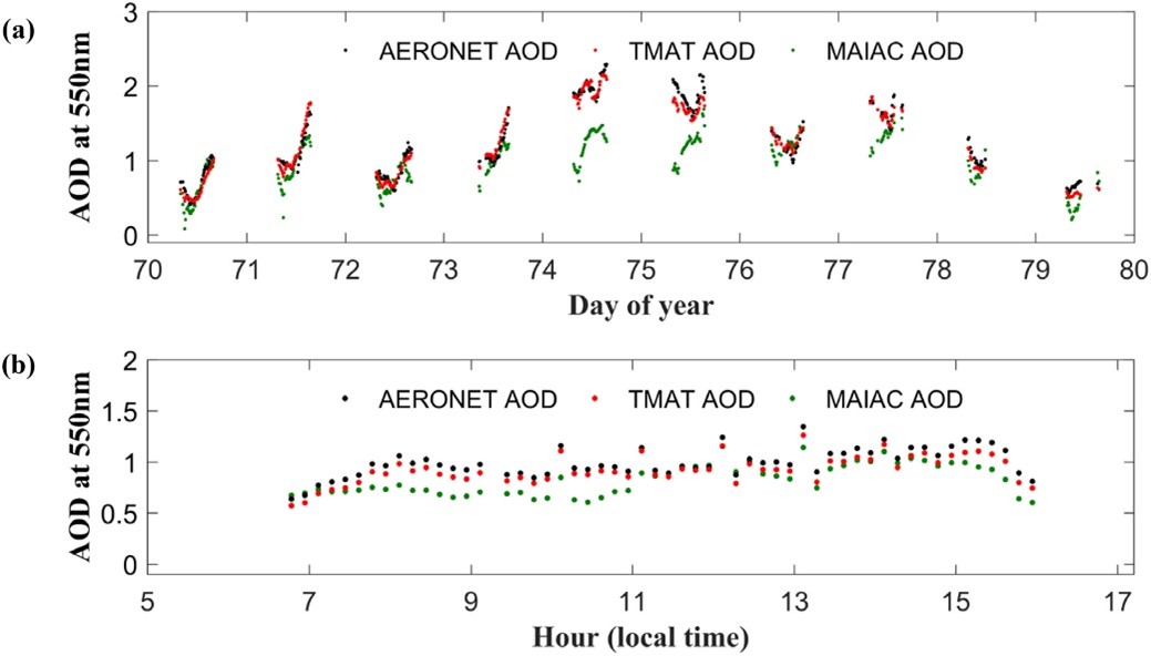 图4. TMAT-AOD、AHI-MAIAC AOD与AERONET AOD的时间序列比较。